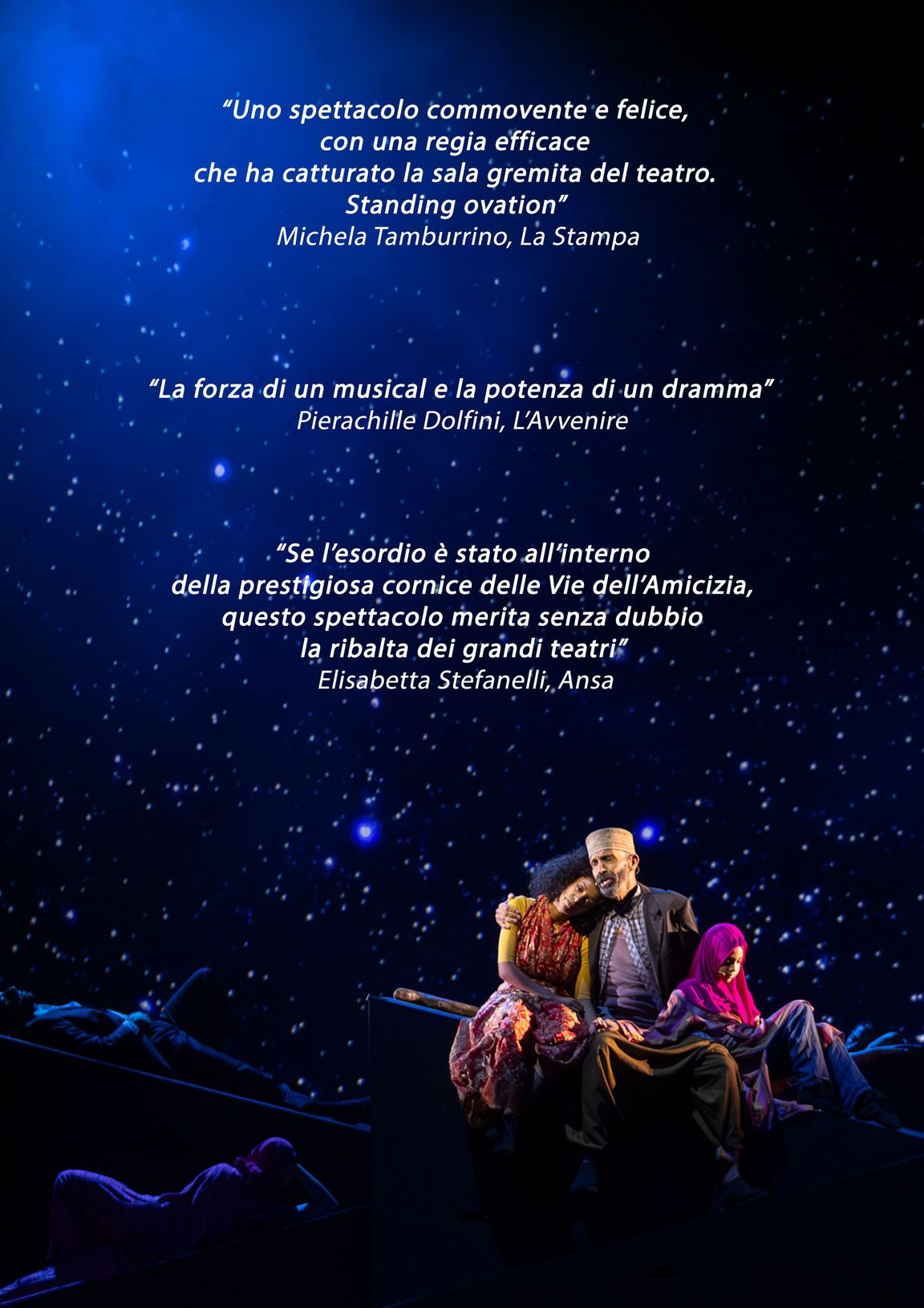 Questo romanzo ha aperto gli occhi e i cuori di molti, tra cui quelli di Cristina Muti, Presidente onorario del Ravenna Festival e di Giorgia Massaro, detentrice dell’idea e dei diritti del libro, e Laura Ruocco che proprio insieme al Ravenna Festival hanno dato vita a questa storia portando in scena la prima mondiale dello spettacolo in occasione de “Le vie dell’amicizia” a Ravenna l’8 Luglio 2024.